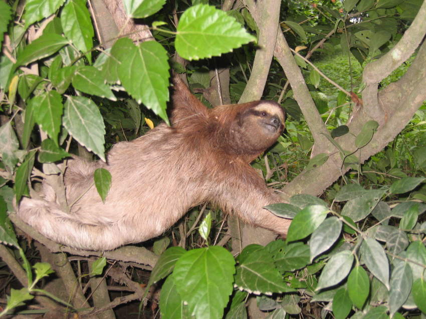 Of the five sloth species occurring in Costa Rica, there are two main families of sloths: two-toed and three-toed sloths. As is well-known of them, they are very slow movers, that spend most of their lives on trees, where they feed on leaves. Because their diet consists of this poor nutrition, their metabolism is so low that it calls for their laziness and low body temperature. The best call to find sloths is to look out for the distinctive Cecropias (called "guarumo" in Costa Rica) or other large-leaved trees: this is where they usually “hang out” (upside down). Sloths switch trees every 2-3 days.